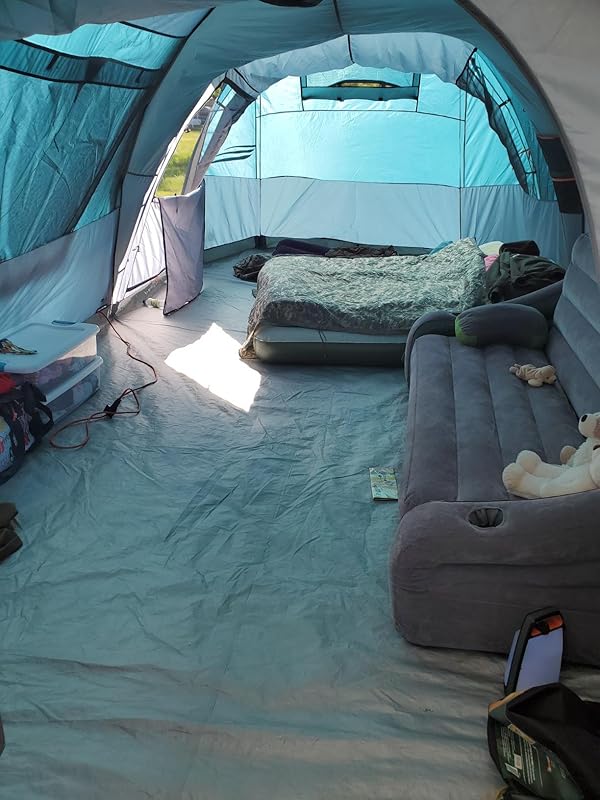 First, this is a well designed and constructed spacious tent. We purchased a NTK Laredo GT tent two years ago after much research and we were thoroughly pleased with our experience with the Laredo (I posted a 5 star review for the Laredo on Amazon on Sept 22, 2016 under SAJ).We wanted a large tent with two doors and windows with good ventilation. We knew that NTK was a quality brand so we did not hesitate to purchase the Super Arizona and we’re happy with the result.We set up the Arizona a mere 30 feet from our home on our ideal location which happened to be hard packed gravel. Why this location you ask? You would have to know our neighbor! To protect the bottom on the tent I laid down 6 and a quarter sheets of 1/2″ plywood (actually 19/32″ exterior plywood purchased from Lowe’s). One sheet had to be cut lengthwise and a quarter sheet from the seventh sheet to complete the 10′ x 20′ footprint. A tarp then went on top before assembling the tent. Pitching the tent was pretty straightforward thanks to the color coding of the poles. A note on the poles. Several reviewers said that they broke poles while erecting them and others said that this tent is pitched easily with one person. Unless you are very experienced at this I would recommend getting help at least with raising the two red crossmember poles. I had help raising them and even then felt sure at one point that the pole would surely snap. Thankfully it did not and the rest went smoothly until time to put on the rainfly. We tied two guy lines to one end and pulled it over quite easily.As you can see in the photos, we had an Intex queen size (22″ high) air bed, an Intex 6 foot long air couch(34″ high), and a card table with two chairs set up in the tent with room to spare! Due to the slope of the tent anything with any height will have a gap between it and the wall. The bed and couch had a gap of 12 to 18 inches depending on where you put them (end or side wall). This, of course provides room for clothes or other gear. We also had three 5’x 7′ area rugs for comfort and extra insulation and an extension cord (with GFI for safety) to power a laptop, a coffee maker, and a Lasko squirrel cage type fan. That fan really puts out a tremendous amount of air even on the lowest of three settings. As you can tell we were not roughing it by any means. Oh, we also had a 4×4 (13’x13′) DD tarp set up and our NTK Laredo set up as a dressing/ hygiene tent.There’s much more that I could write but suffice it to say that this is an excellent tent. We had no leaks at all even with several days of rain and wind. We would highly recommend this tent!Wish list:Include metal poles (similar to the door canopy poles) to elevate the windows for more than a 25% view.Make windows accessible from the inside.Make inside height at least 6′-5″ the entire length not just the very center where the poles cross.Make the door canopy wider than the door opening to prevent rain from entering the tent when the canopy is extended.Not complaining. Just wishing! 🙂The picture shows how the windows can be simply modified for a full view instead of the partial view as provided by NTK. Shown is something that I put together in just a few minutes using two tree branches about 66″ long used as vertical supports and one horizontal branch which is needed to redirect and support the tent guy line.For those who may be wondering, the picture of the tent with the tarp and Dutch oven tripod is showing the NTK Laredo Tent which we used in addition to the NTK Super Arizona..